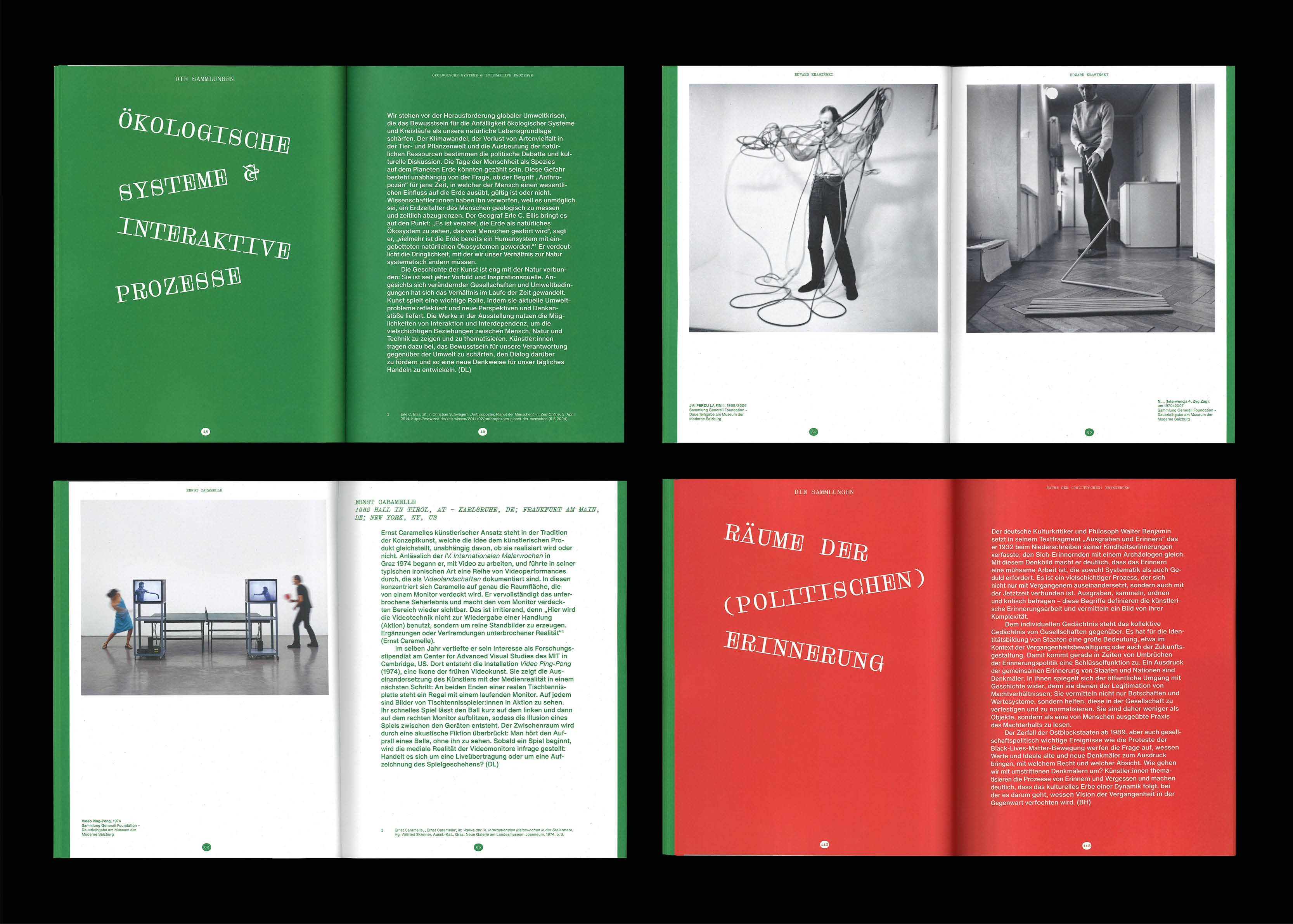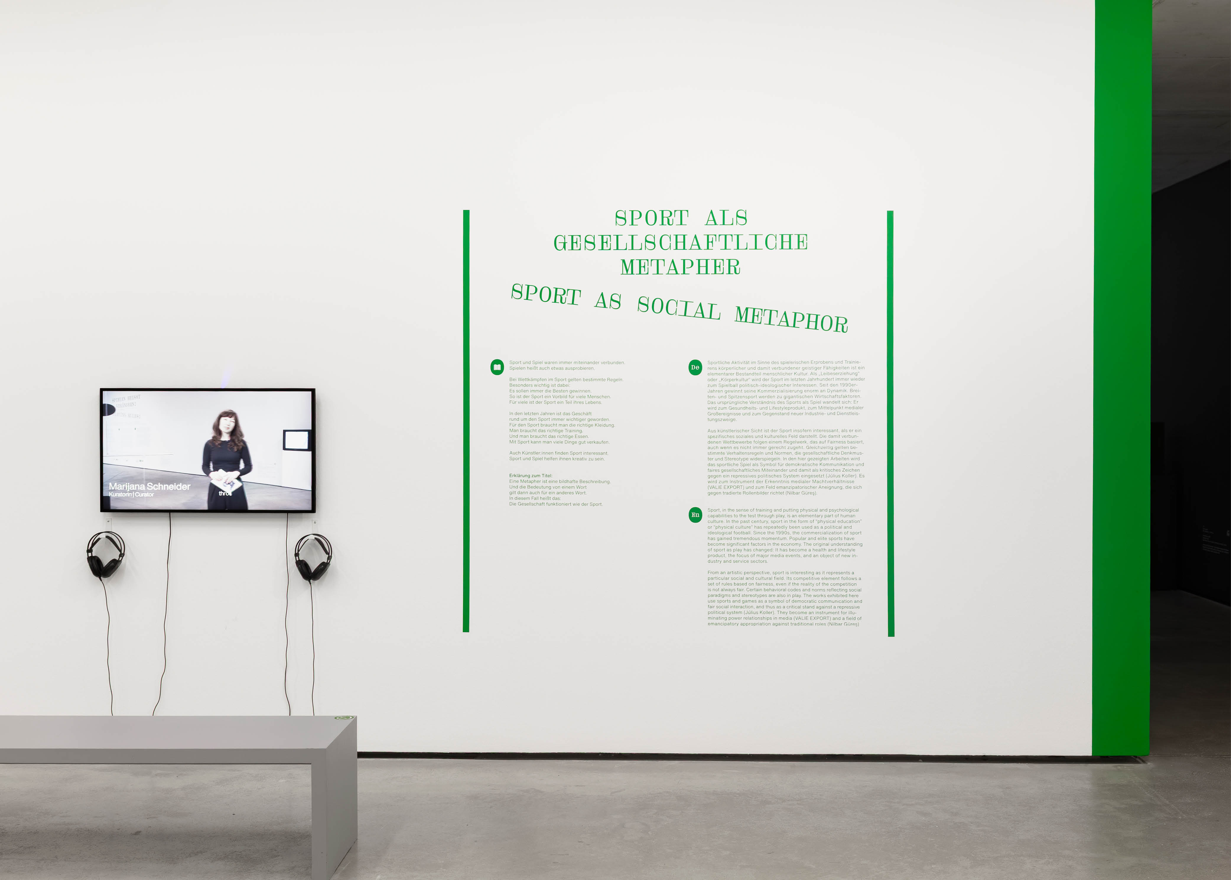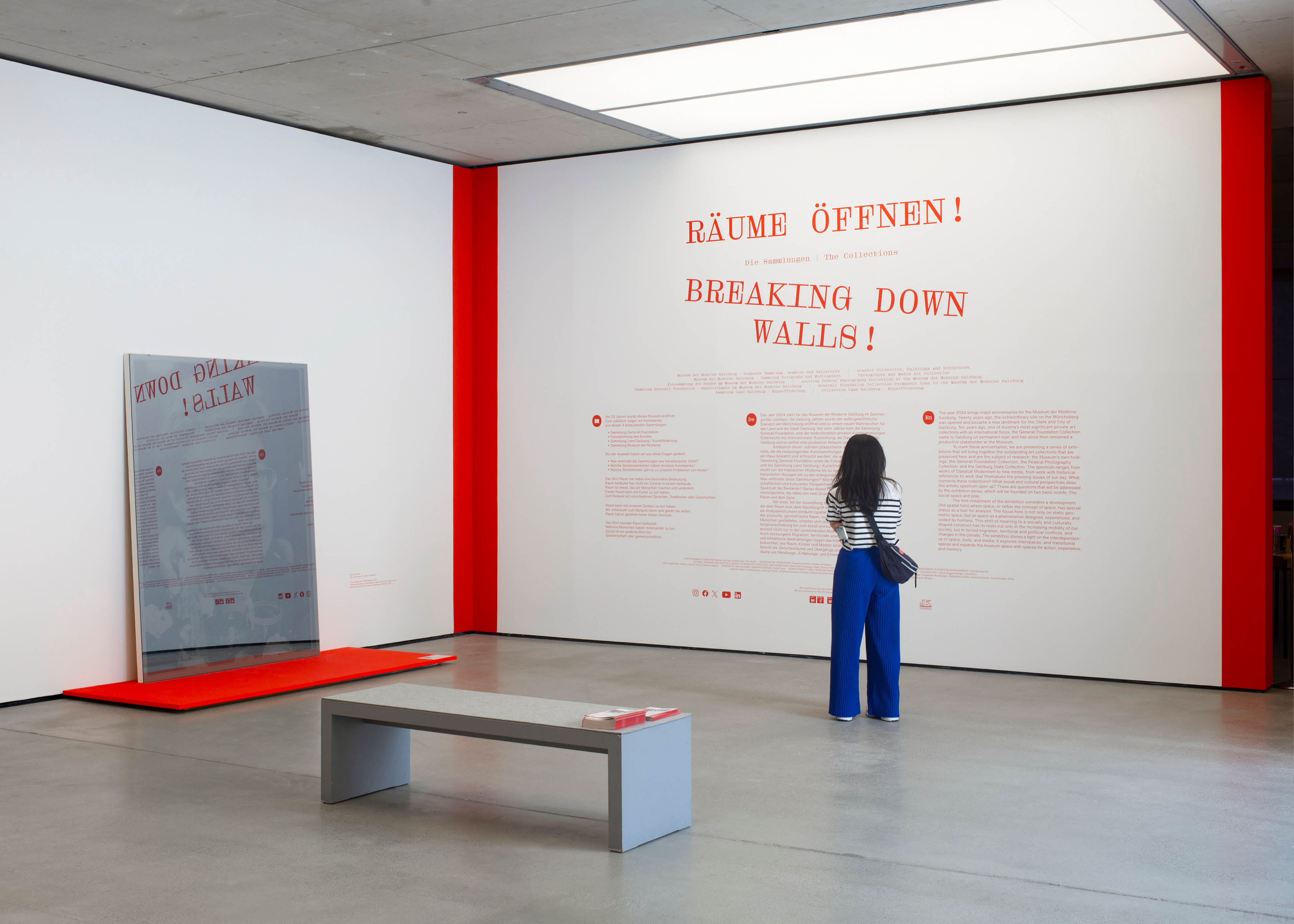 Die Ausstellungen »Spiele(n) heißt verändern« und »Räume öffnen« im Museum der Moderne Salzburg untersuchen die Themen Raum und Spiel. Die Gestaltung macht dieses Spannungsfeld durch eine prägnante visuelle Sprache erfahrbar. Kern des Konzepts sind farbige Streifen, die nach dem Prinzip von Spielfeldmarkierungen eingesetzt werden. Sie verlaufen entlang von Wandkanten, über Ecken und gliedern Übergänge sowie Zonen. Damit greifen sie die Logik von Spielfeldrändern auf und übertragen diese subtil in den Ausstellungsraum. Ergänzend wurde eine leicht geneigt gesetzte Typografie eingesetzt, die als spielerisches Element die Strenge der Linienführung auflöst und Dynamik erzeugt.