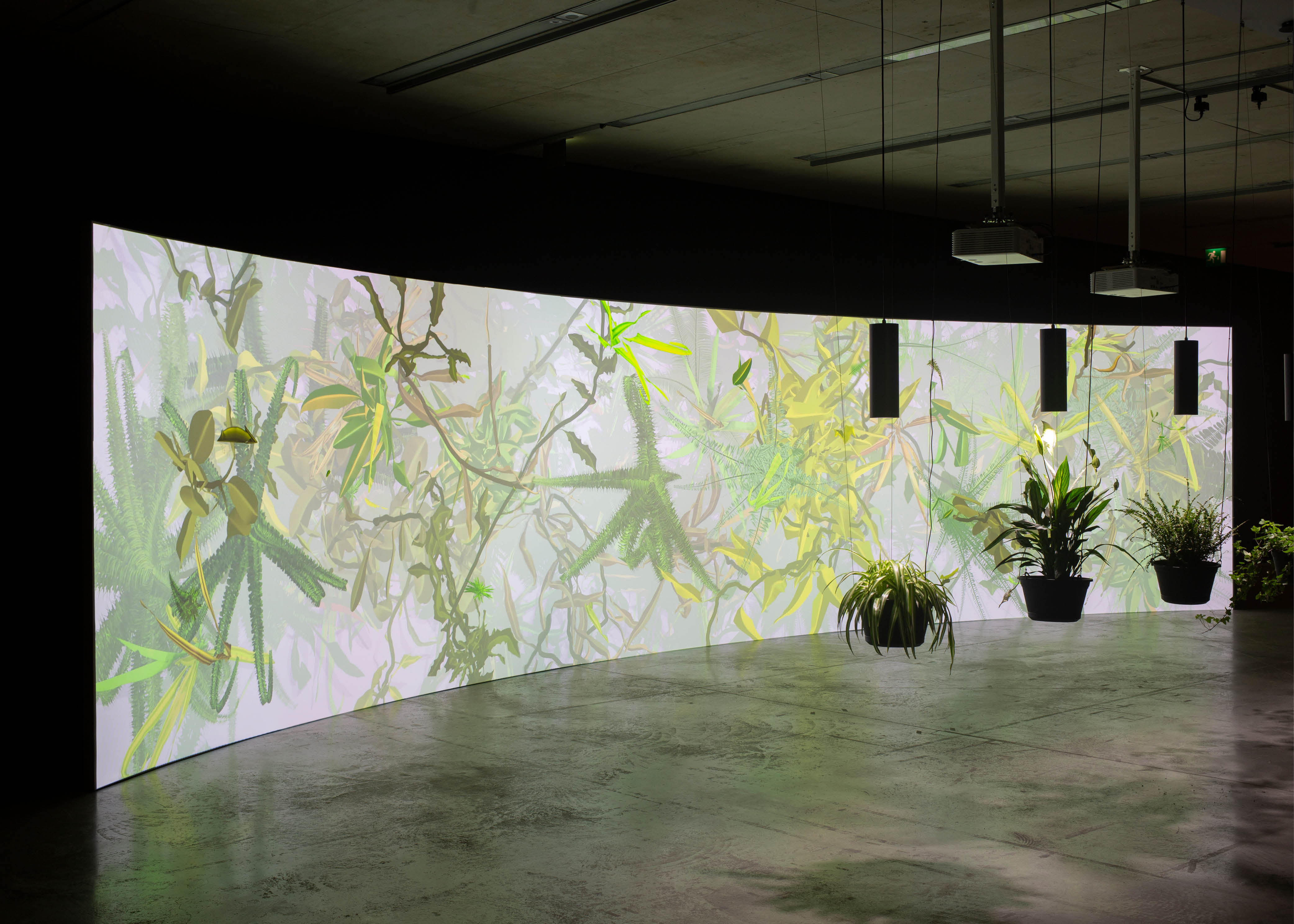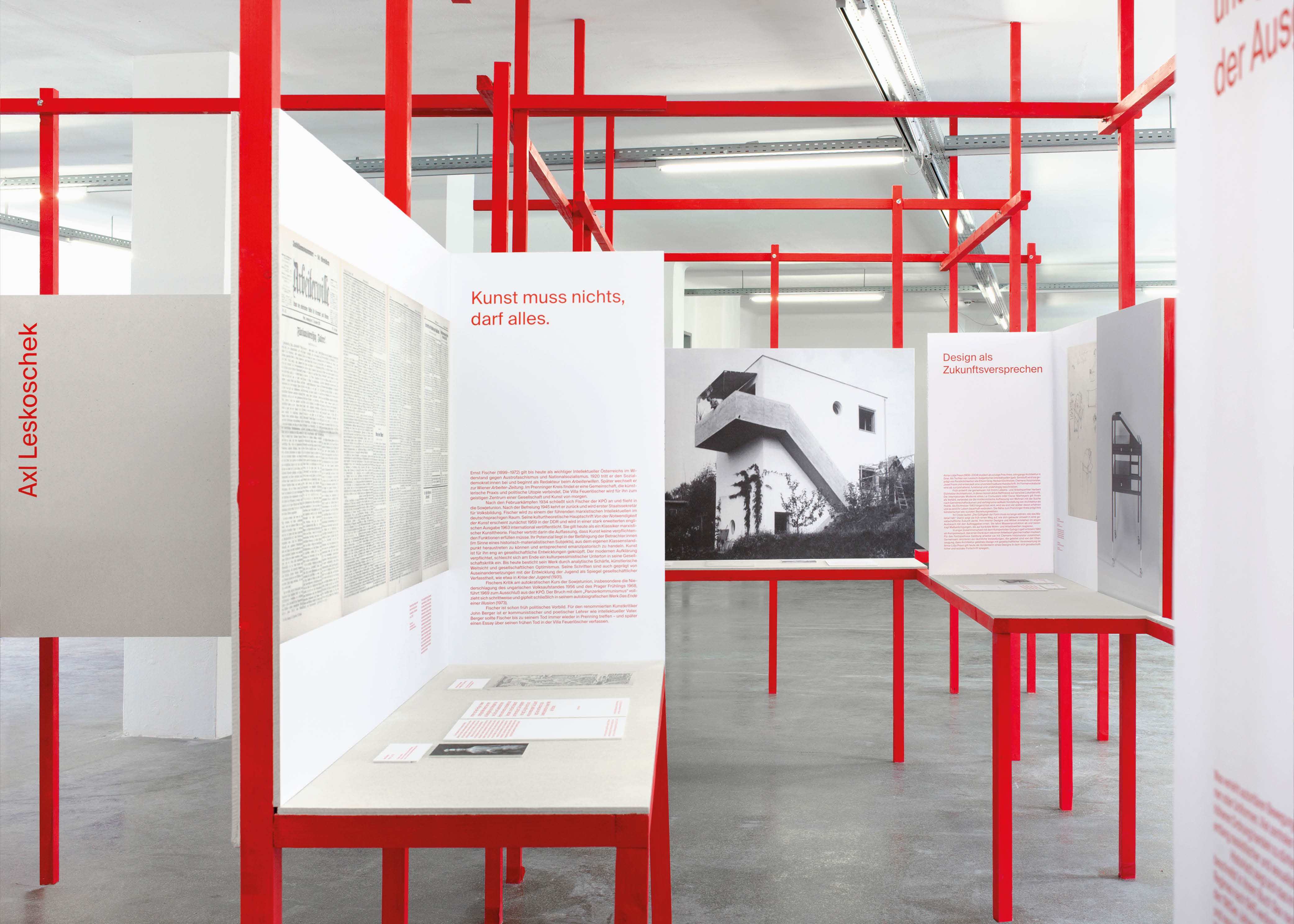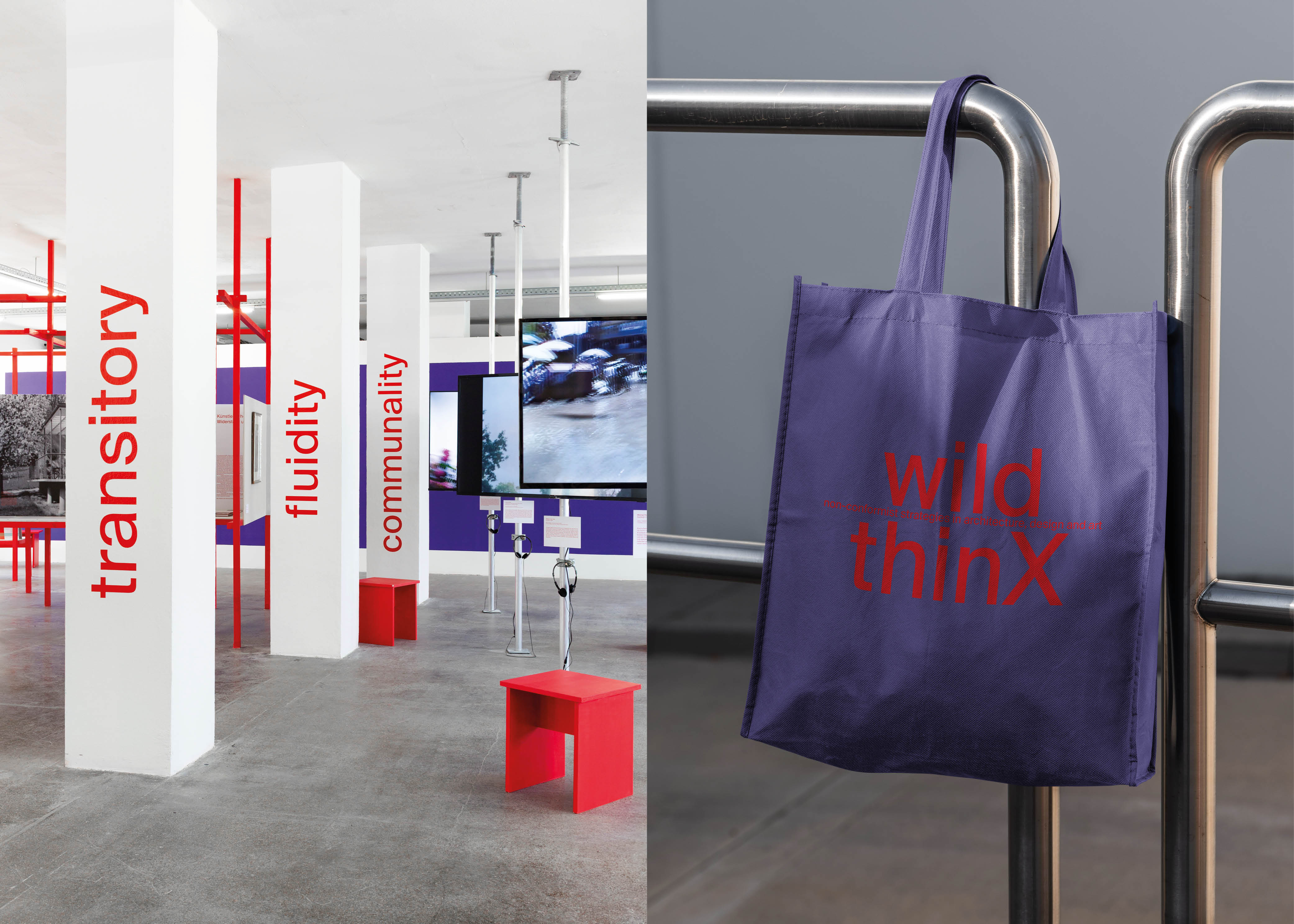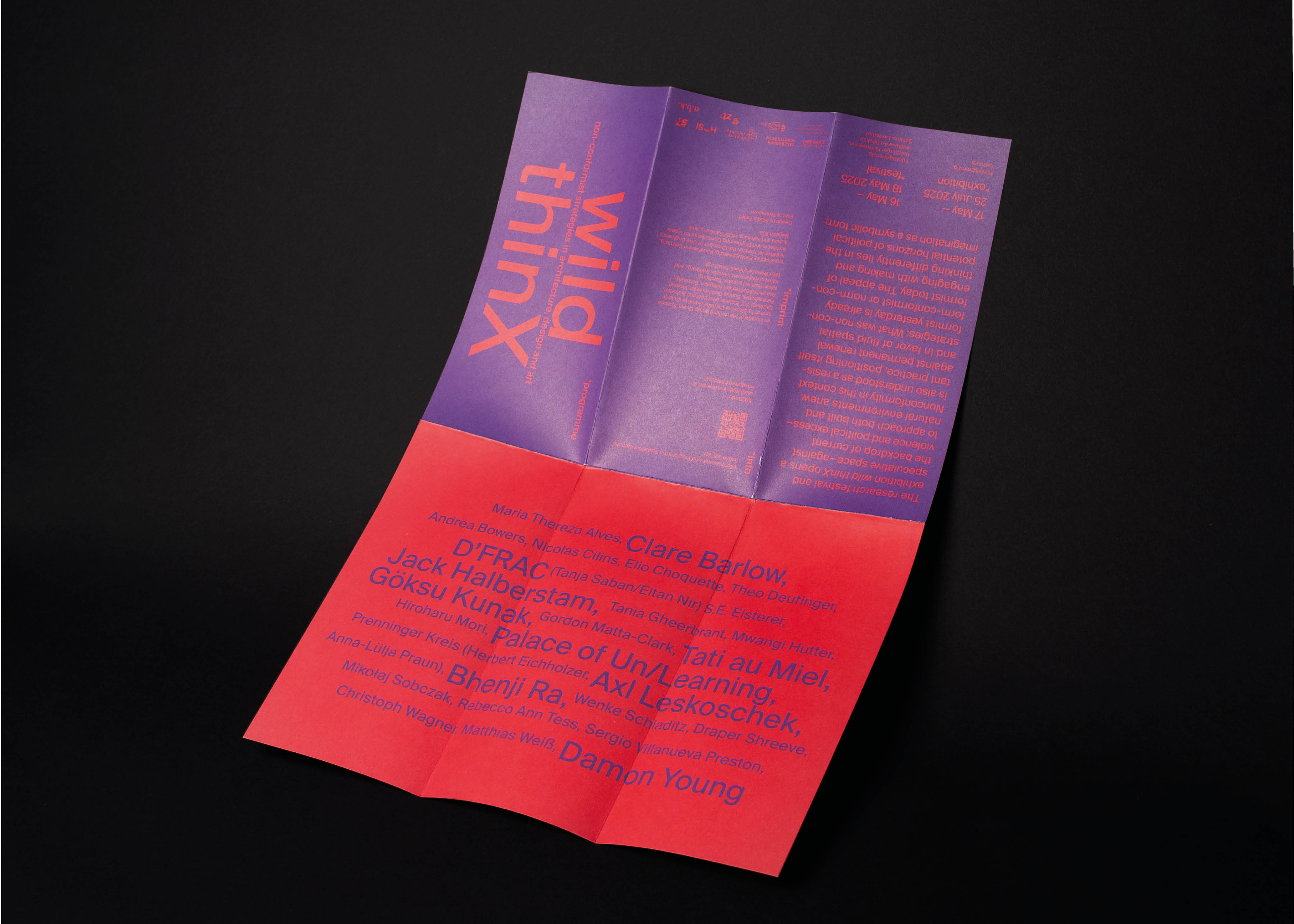 Die Ausstellung »wild thinx« eröffnet vor dem Hintergrund aktueller Krisen einen spekulativen Raum für Forschung und ästhetische Praxis. Nonkonformität wird nicht inszeniert, sondern als widerständige Strategie in Architektur, Design und Kunst erfahrbar. Ein Gerüst aus roten Stangen gliedert den Raum als offenes Raster. Daran sind Texttafeln befestigt; Exponate auf Pulten besetzen die Nischen. So entsteht eine begehbare Austellungsarchitektur mit wechselnden Blickwinkeln. Das kraftvolle Rot setzt einen klaren Akzent, das Violett der Wände bildet das atmosphärische Gegengewicht. Die Farbe entzieht sich eindeutiger Zuordnung und bricht die Neutralität klassischer Ausstellungsräume. Auf Deckenstützen installierte Bildschirme fügen eine digitale Ebene hinzu: Sie bringen Bewegung ins Raster und eröffnen eine zweite, visuelle Schicht.