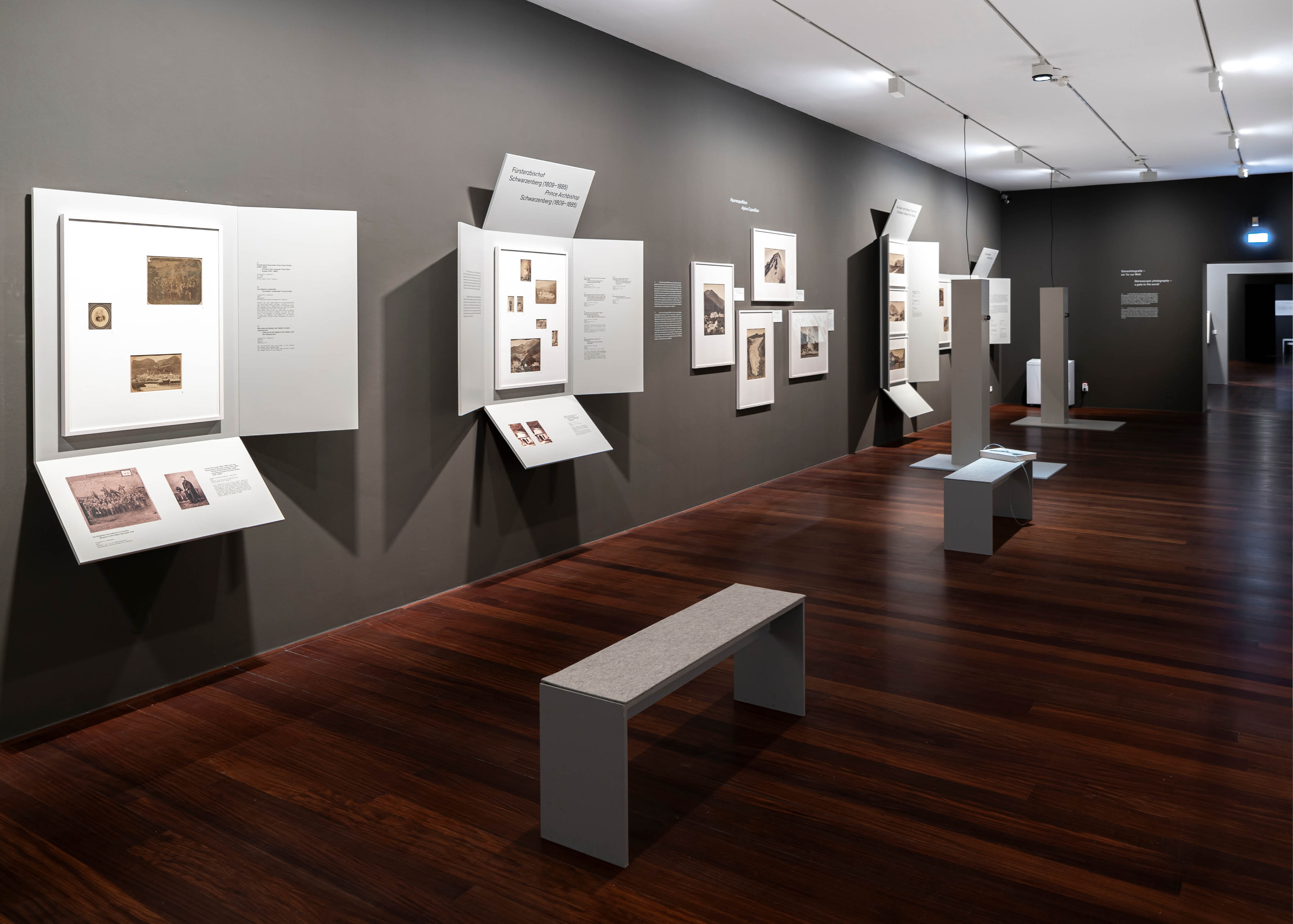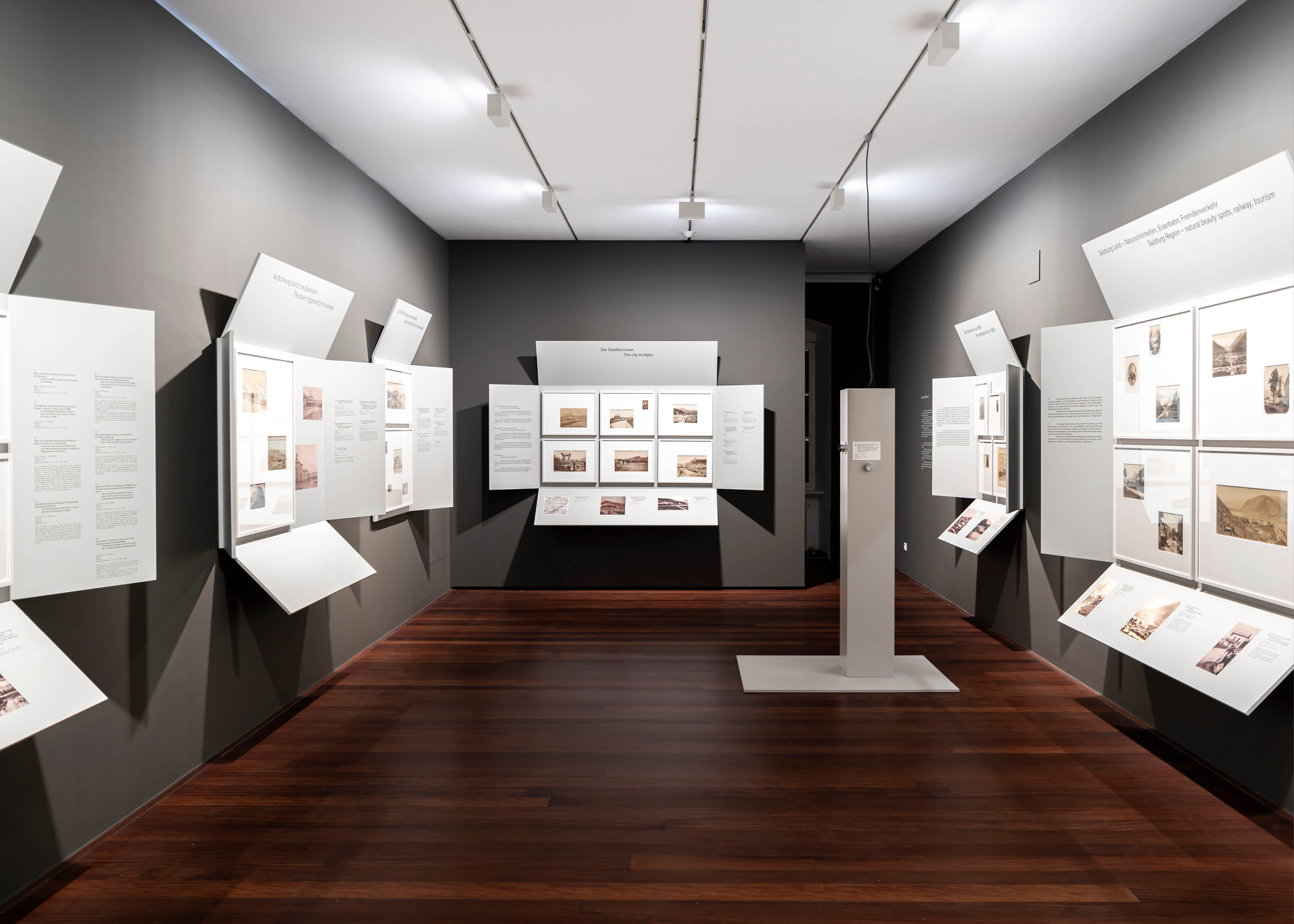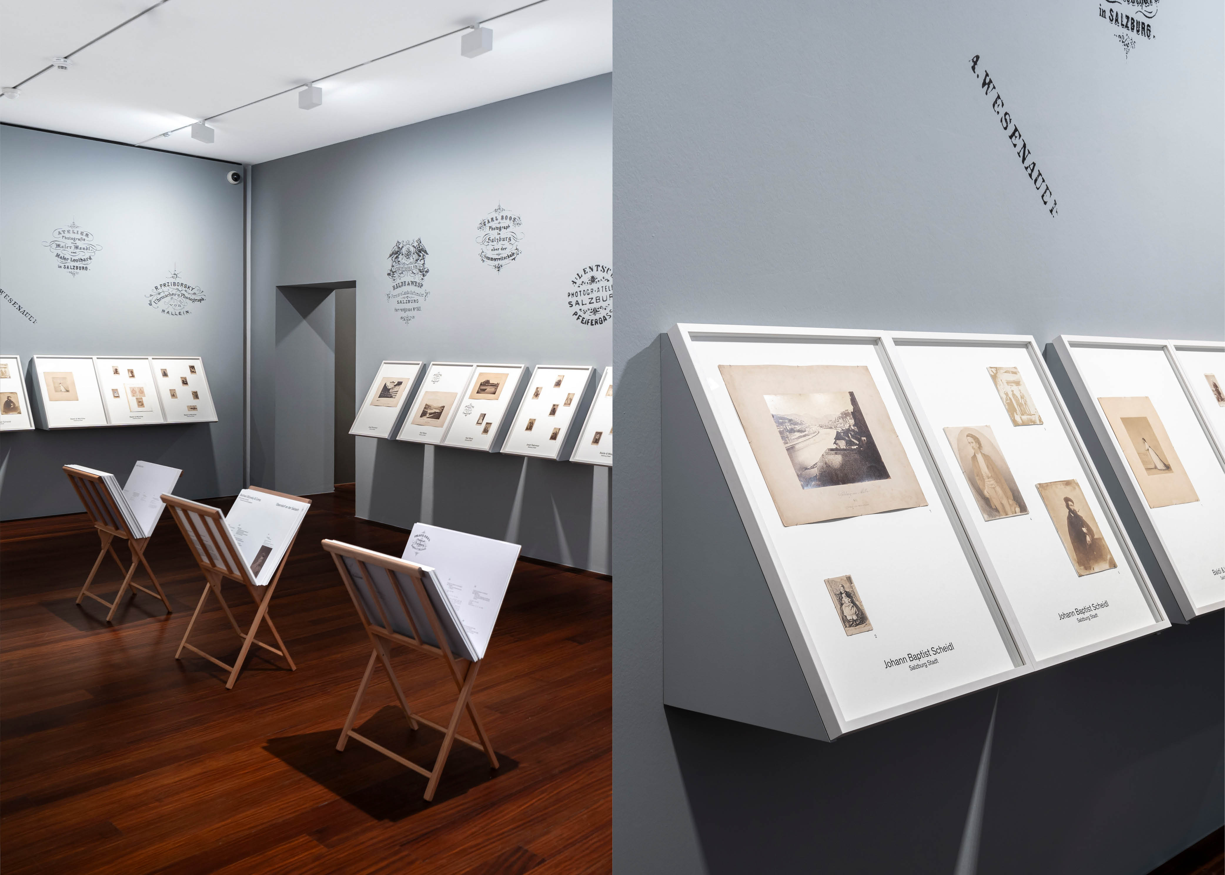 Die Ausstellung »Bilderwende. Zeitenwende« des Salzburg Museum zeigt die Geschichte der frühen Fotografie in Salzburg. Die Gestaltung unterstützt die dichte Präsentation von Bild- und Textmaterial durch klare typografische Strukturen und Ausstellungselemente. Die Gestaltung entstand in Zusammenarbeit mit Juliette Israël und reagiert auf die Materialfülle mit einem klaren Ordnungssystem. Unterschiedliche Displayformen, formal an Archivboxen angelehnt, gliedern die Ausstellung. In Klappen integriert, tragen sie verschiedene Textsorten und öffnen sich gleichsam der Geschichte der Fotografie. Die Typografie basiert auf der Theinhardt-Familie von Optimo. Die sachlich-konstruierte Grotesk zeichnet sich durch präzise Proportionen und eine zurückhaltende Anmutung aus, die eine klare, ruhige Textgestaltung ermöglicht. In Kombination mit der Monospace-Variante entsteht ein dokumentarischer Charakter, der an technische Beschriftungen und Archivpraxis erinnert – eine bewusste Referenz an die Forschungs- und Sammlungskontexte der Ausstellung. (Ausstellungsansichten: Helena Kalleitner).