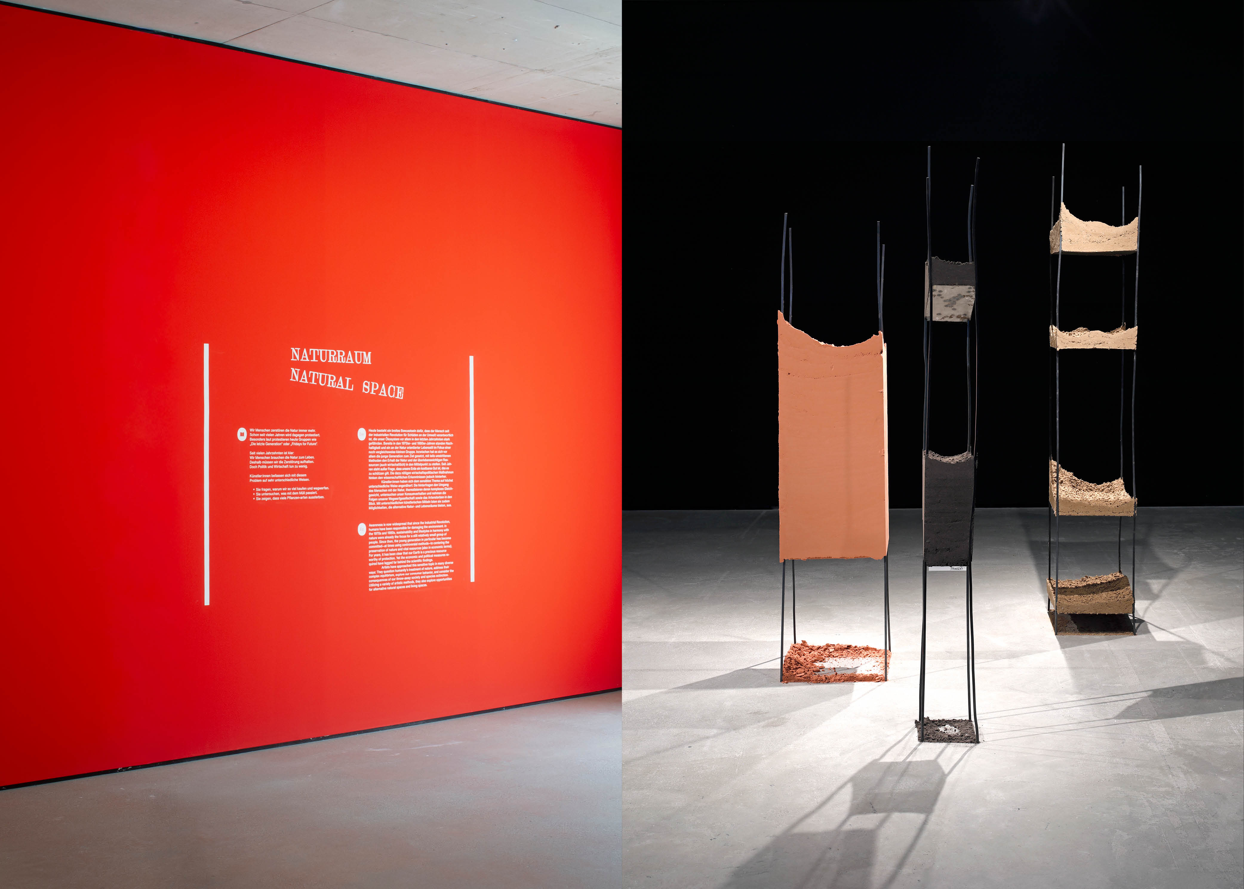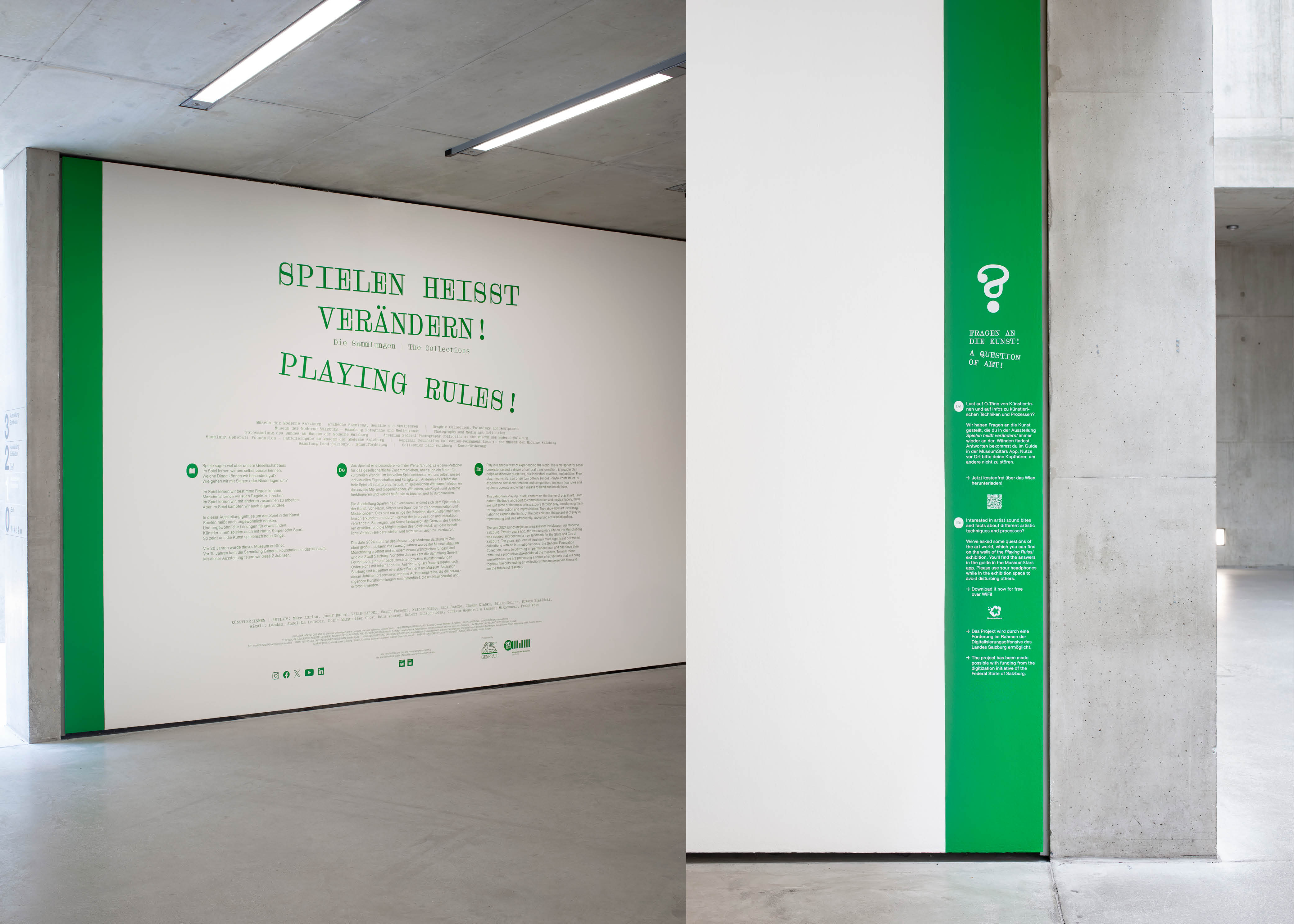 Die Ausstellungen »Spiele(n) heißt verändern« und »Räume öffnen« im Museum der Moderne Salzburg untersuchen die Themen Raum und Spiel. Die Gestaltung macht dieses Spannungsfeld durch eine prägnante visuelle Sprache erfahrbar. Kern des Konzepts sind farbige Streifen, die nach dem Prinzip von Spielfeldmarkierungen eingesetzt werden. Sie verlaufen entlang von Wandkanten, über Ecken und gliedern Übergänge sowie Zonen. Damit greifen sie die Logik von Spielfeldrändern auf und übertragen diese subtil in den Ausstellungsraum. Ergänzend wurde eine leicht geneigt gesetzte Typografie eingesetzt, die als spielerisches Element die Strenge der Linienführung auflöst und Dynamik erzeugt.
