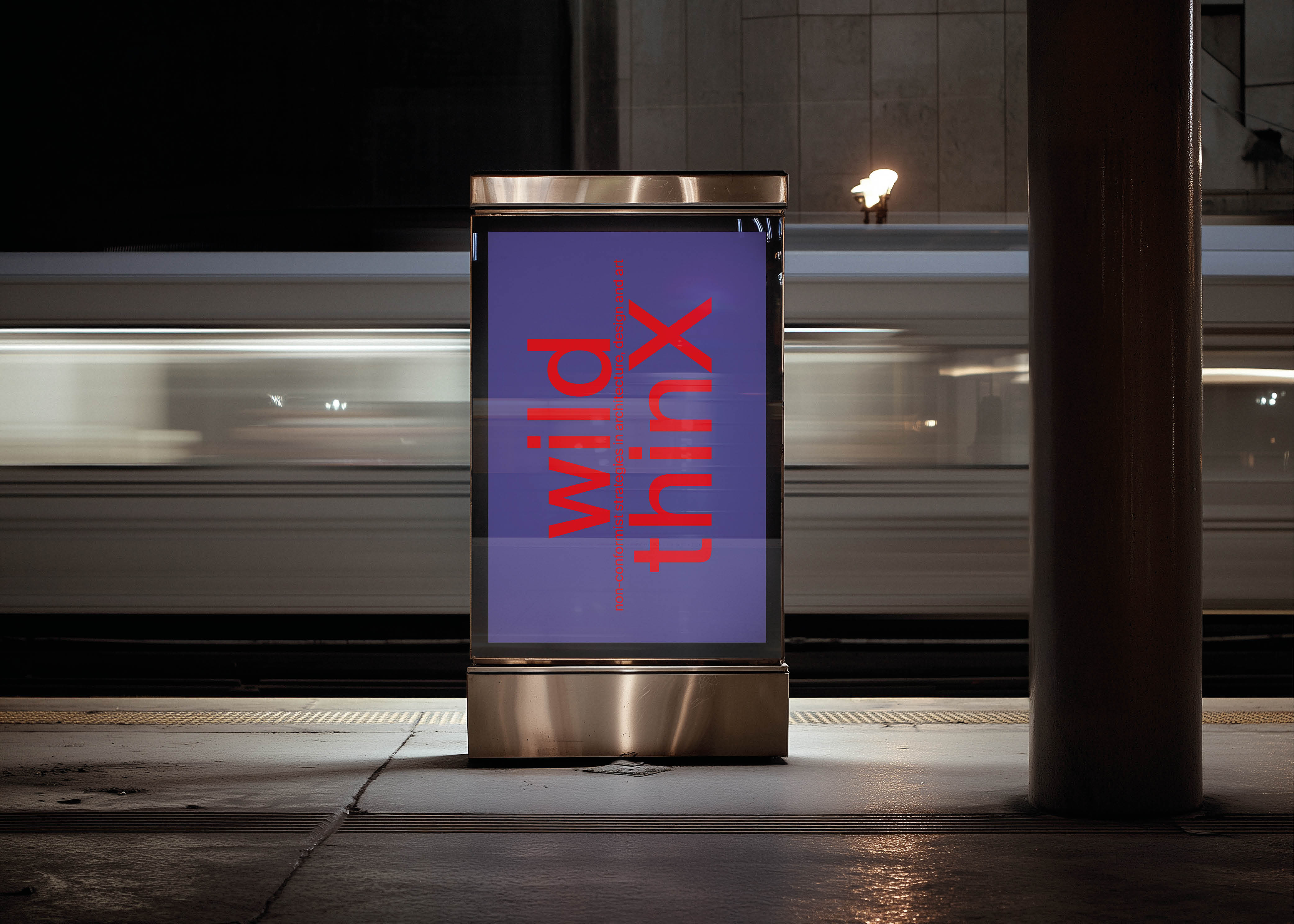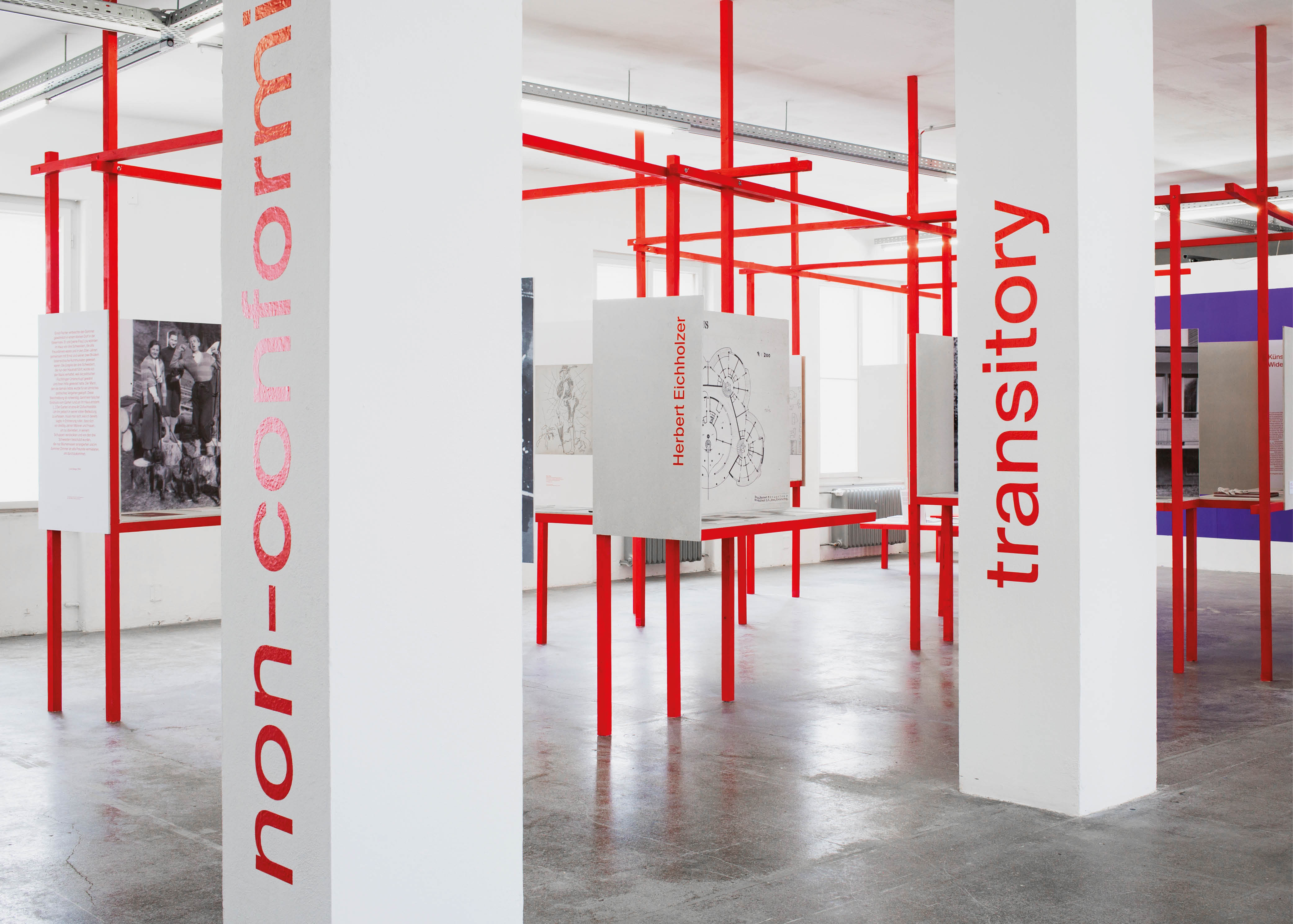 Die Ausstellung »wild thinx« eröffnet vor dem Hintergrund aktueller Krisen einen spekulativen Raum für Forschung und ästhetische Praxis. Nonkonformität wird nicht inszeniert, sondern als widerständige Strategie in Architektur, Design und Kunst erfahrbar. Ein Gerüst aus roten Stangen gliedert den Raum als offenes Raster. Daran sind Texttafeln befestigt; Exponate auf Pulten besetzen die Nischen. So entsteht eine begehbare Austellungsarchitektur mit wechselnden Blickwinkeln. Das kraftvolle Rot setzt einen klaren Akzent, das Violett der Wände bildet das atmosphärische Gegengewicht. Die Farbe entzieht sich eindeutiger Zuordnung und bricht die Neutralität klassischer Ausstellungsräume. Auf Deckenstützen installierte Bildschirme fügen eine digitale Ebene hinzu: Sie bringen Bewegung ins Raster und eröffnen eine zweite, visuelle Schicht.
